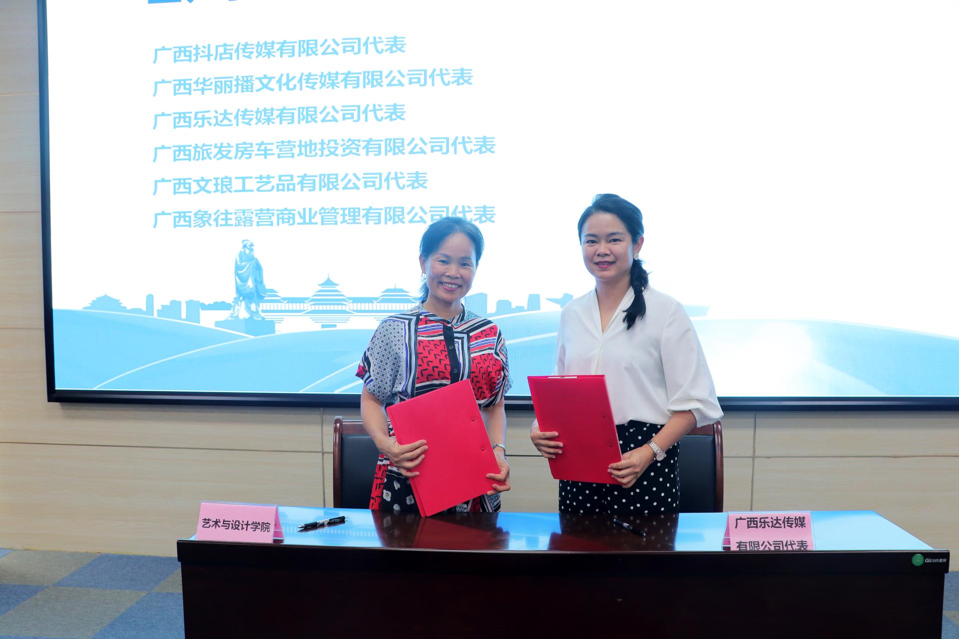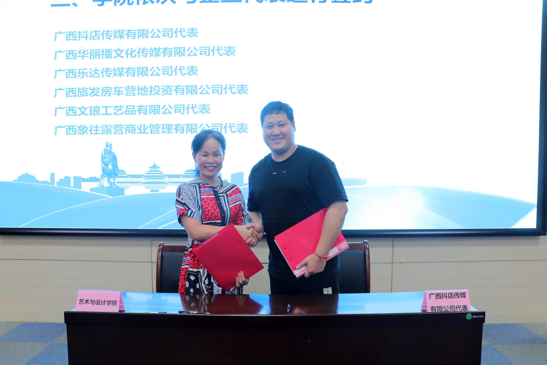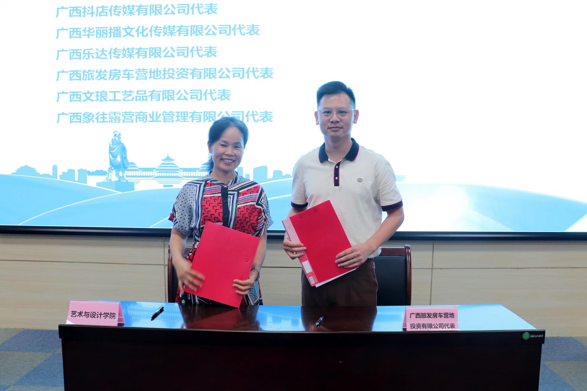 为深化产教融合创新与协同育人,推进学院专业建设与发展。7月11日下午,艺术与设计学院在大学生活动中心举行校企合作签约仪式暨实践教学研讨活动,广西抖店传媒有限公司、广西华丽播文化传媒有限公司、广西乐达传媒有限公司、广西旅发房车营地投资有限公司、广西文琅工艺品有限公司、广西象往露营商业管理有限公司、南宁市建筑规划设计集团有限公司生态园林分院7家企业代表,艺术与设计学院院长杨小凤及学院全体教师参加活动,活动由副院长蓝志军主持。