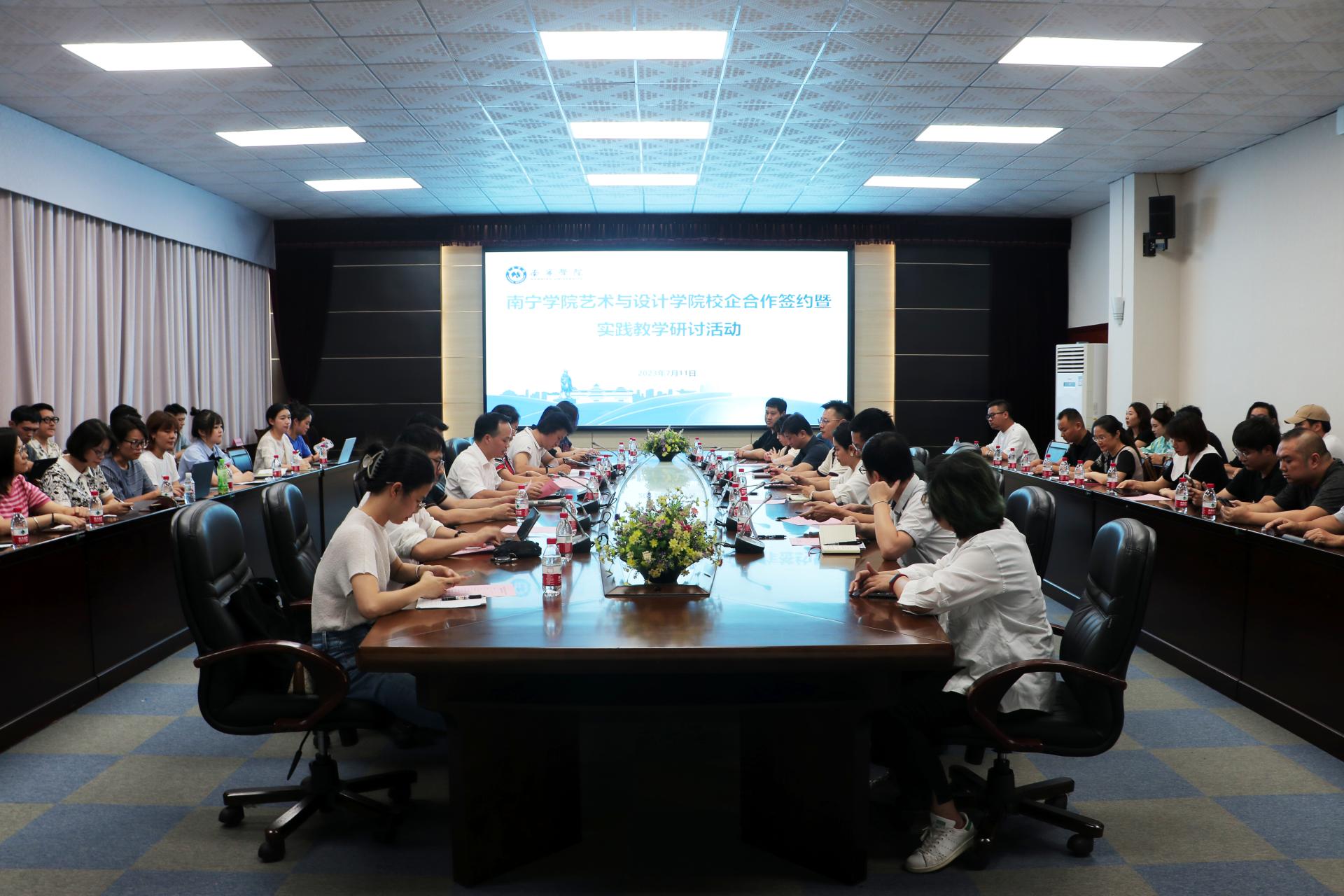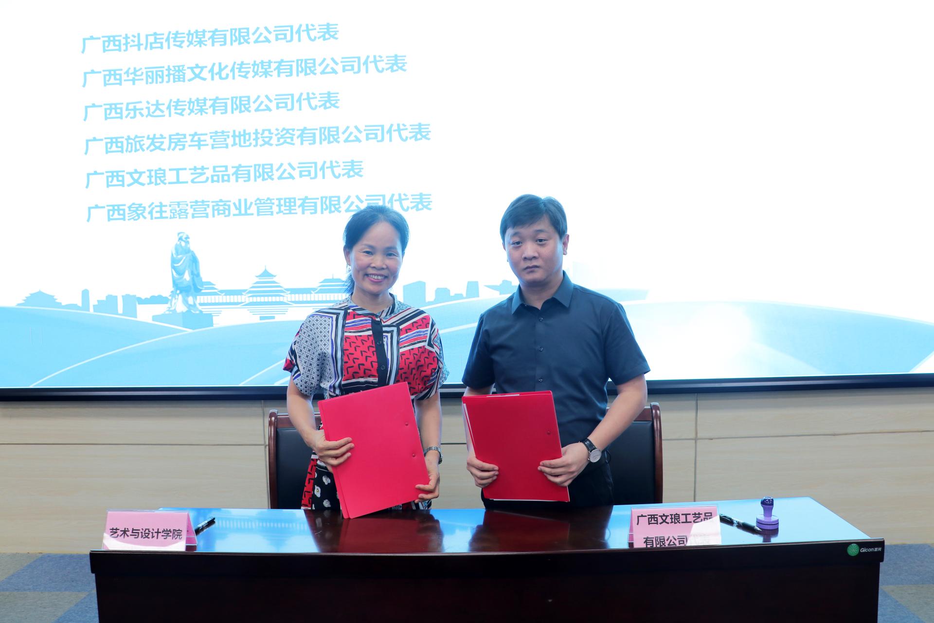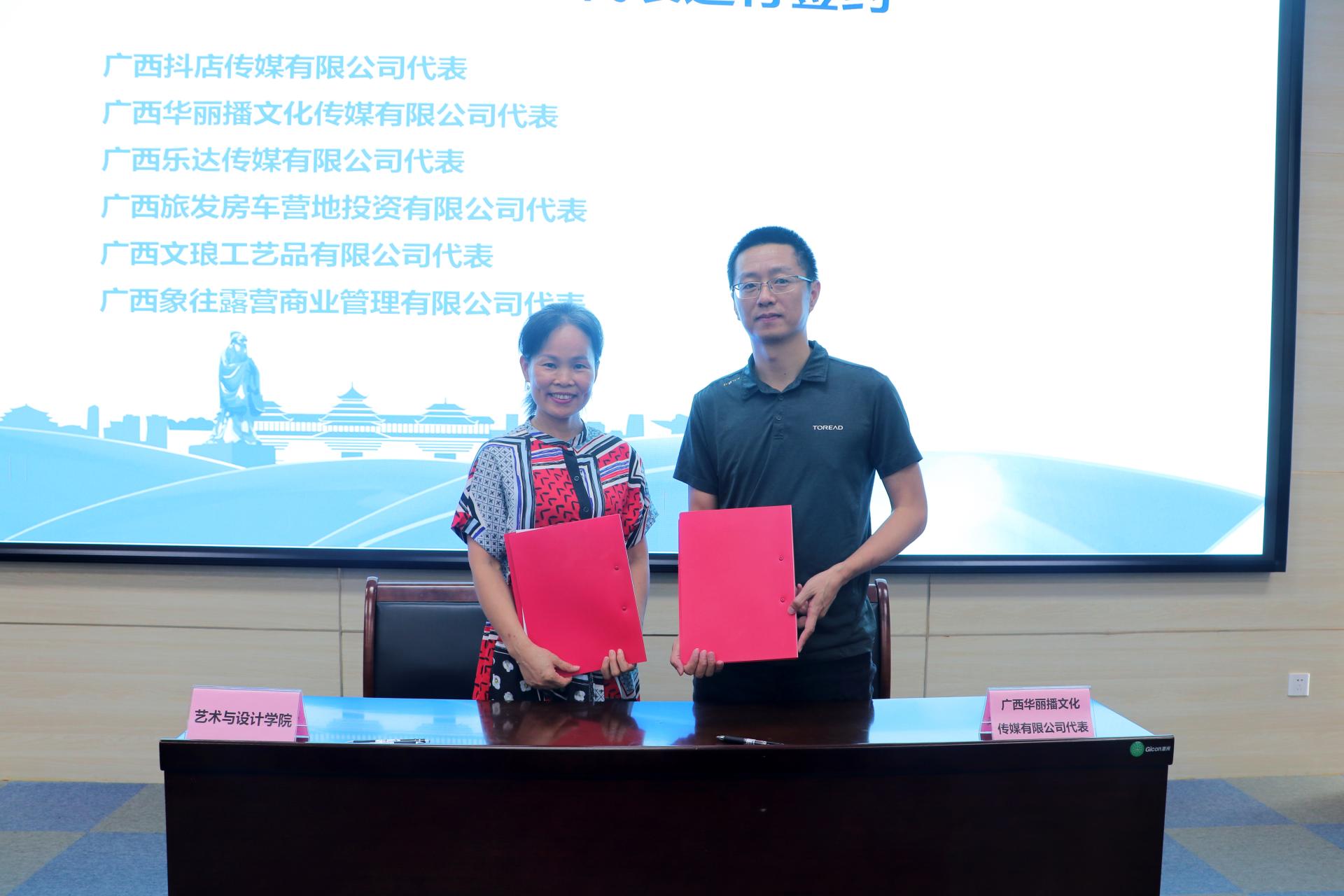 为深化产教融合创新与协同育人,推进学院专业建设与发展。7月11日下午,艺术与设计学院在大学生活动中心举行校企合作签约仪式暨实践教学研讨活动,广西抖店传媒有限公司、广西华丽播文化传媒有限公司、广西乐达传媒有限公司、广西旅发房车营地投资有限公司、广西文琅工艺品有限公司、广西象往露营商业管理有限公司、南宁市建筑规划设计集团有限公司生态园林分院7家企业代表,艺术与设计学院院长杨小凤及学院全体教师参加活动,活动由副院长蓝志军主持。