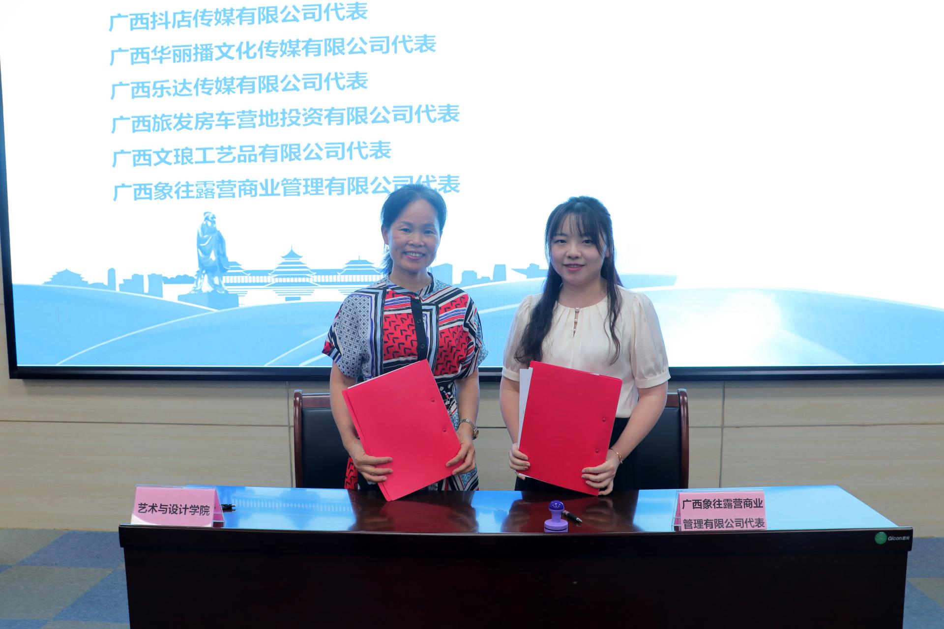 接着,校企双方进行合作签约。院长杨小凤代表学院与广西抖店传媒有限公司、广西华丽播文化传媒有限公司、广西乐达传媒有限公司、广西旅发房车营地投资有限公司、广西文琅工艺品有限公司、广西象往露营商业管理有限公司签订合作协议。