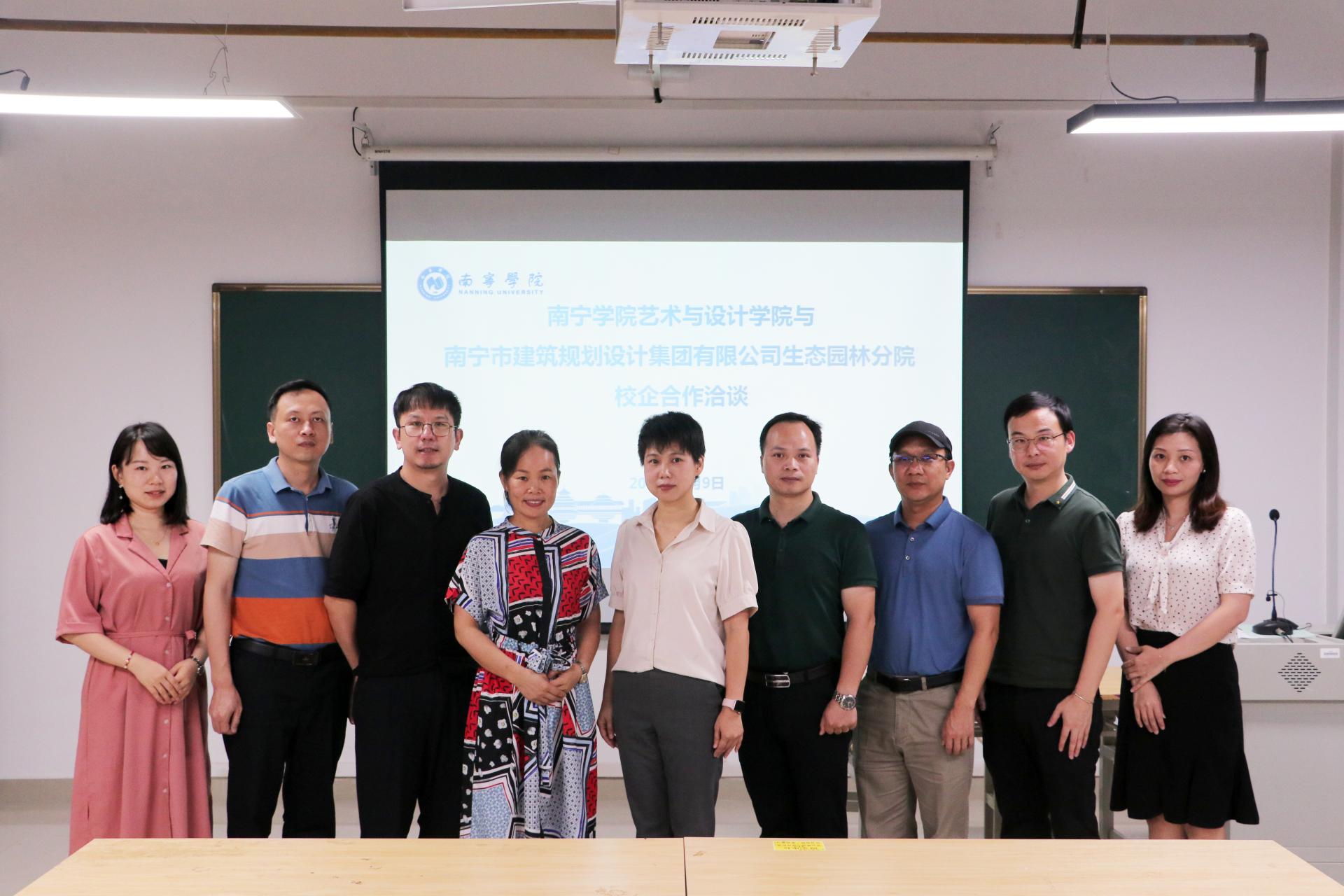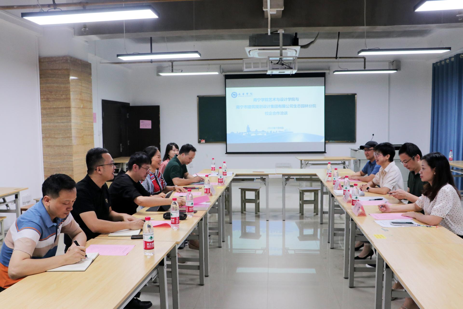 7月9日上午,艺术与设计学院与南宁市建筑规划设计集团有限公司生态园林分院在综合楼309教室举行校企合作洽谈。南宁市建筑规划设计集团有限公司生态园林分院院长黄雁、副院长廖志宇、总工程师苏瑞坤、专业副总工程师杨筱,艺术与设计学院院长杨小凤、副院长蓝志军及环境设计教研室、学院办公室、实践科教师代表参加洽谈会。