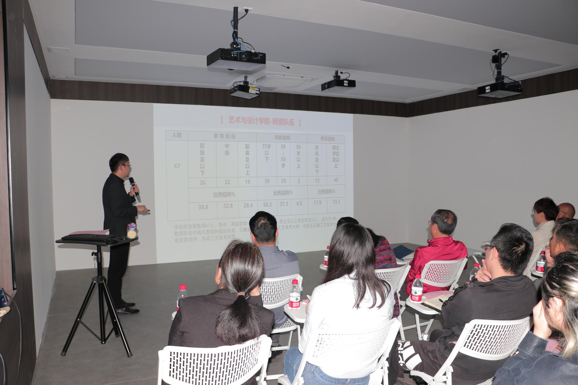 会议分为两个环节进行。首先,艺术与设计学院院长黄宇围绕学院“金课”建设与专业特色发展主题进行思路汇报,分别从会议的背景、“学术型”“应用型”等词的概念解析、学院在应用技术人才培养的框架、教育教学体系构建及存在的问题等方面进行建设思路分享,并针对问题进行了策略分享,此次汇报提出了向产教融合课程转变、重构产教融合课程体系、重构“课”的内容、重构“程”的实施载体、重构“程”的教学模式等改革方向。接着,南宁学院副校长陈雄章围绕此次会议主题,引出了“以知识为中心还是能力为中心”、“以教师为中心还是以学生为中心”、“以教学为中心还是经济社会发展为中心”等宏观问题思考。最后,工艺美术、环境设计、视觉传达设计教研室围绕主题内容开展分教研室座谈研讨,校外专家和院内教师分别从当前行业发展、课程体系设置、专业特色凝练、“金课”建设等内容开展深入、具体研讨。