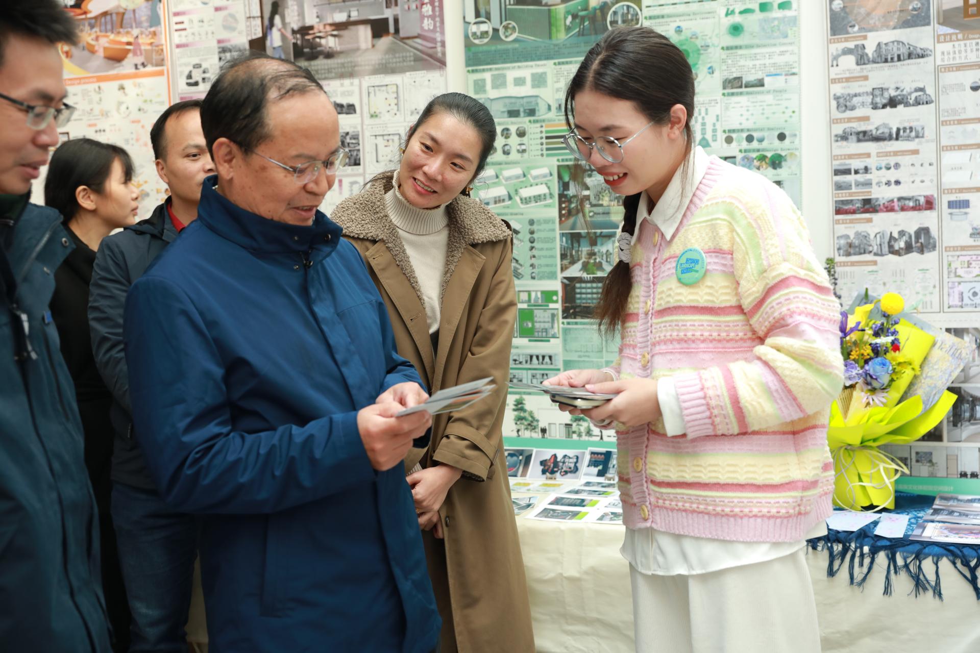 在毕业设计展览期间,南宁学院副校长陈雄章教授参观环境设计专业毕业设计作品,现场与师生、企业代表等互动交流,了解学生对于毕业设计的前期调研与实践创作过程,并对学生作品进行点评,积极鼓励学生走出校园,找到自己的合适的就业岗位。