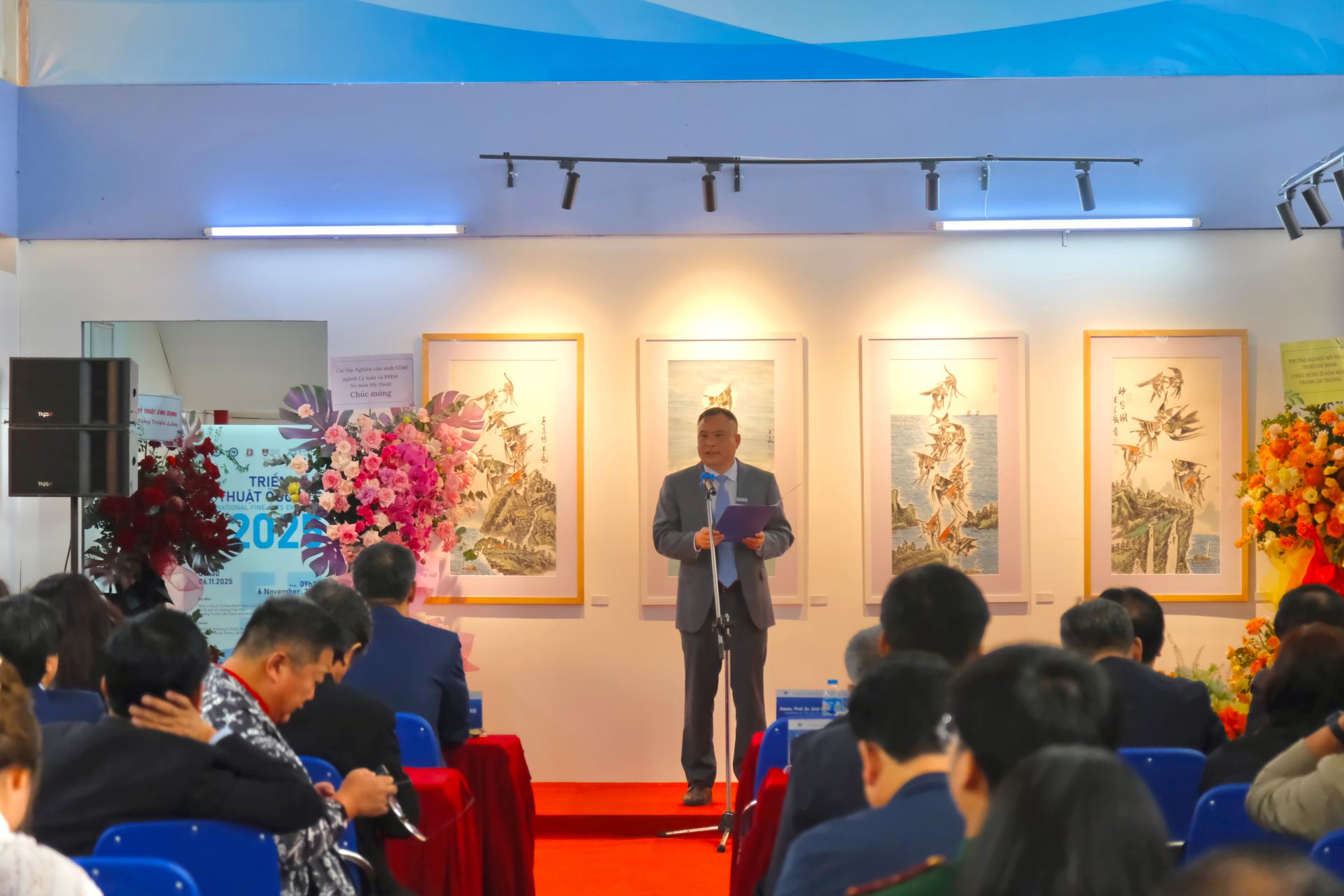 11月6日上午,学院代表团出席了国际艺术展览开幕式,龚击副校长代表南宁学院致辞,向越南中央艺术师范大学建校55周年表示热烈祝贺,并表示中越两国山水相连、文化相通,两校的交流合作是中越友好关系在艺术教育领域的生动实践。学院将以此次活动为契机,进一步推动两校在课程共建、科研合作、师生互访与文化创意等领域的务实合作,共同培养具有国际视野与创新能力的艺术人才。