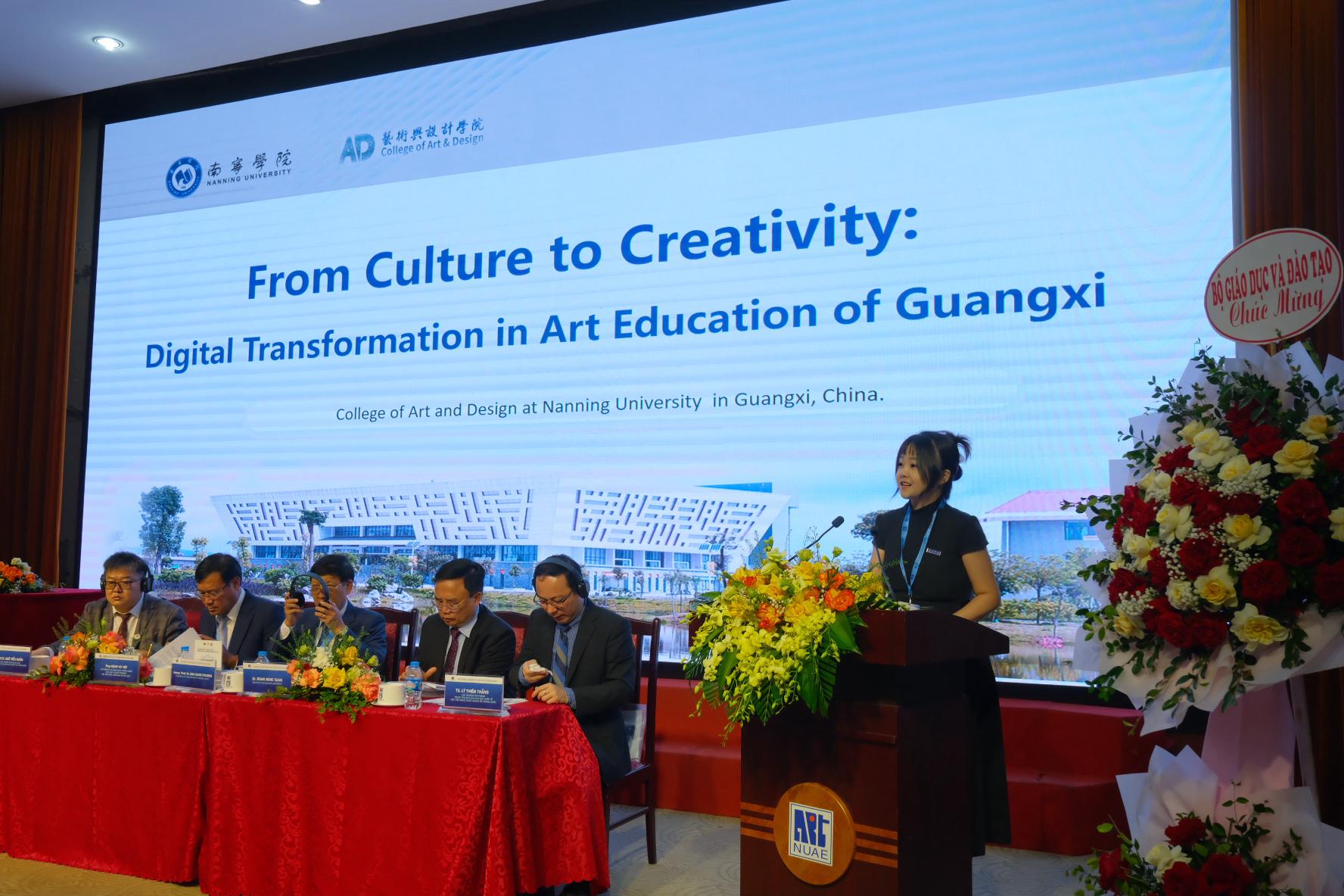 南宁学院艺术与设计学院教师关莹莹博士在会上作了题为《From Culture to Creativity: Digital Transformation in Art Education of Guangxi》 的会议发言,系统介绍了广西地区在非遗数字化教学、数字艺术创作与文化创新方面的探索实践,得到了与会专家的广泛认可与积极响应。