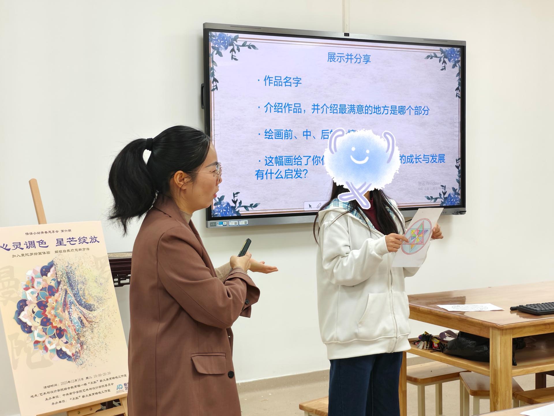 黄老师不仅倾听了参与者的分享,还根据他们的分享的内容一一进行了正向引导,十分珍贵。有位同学手持自己的曼陀罗画作走上台前,坦言此次创作让自己收获满满:“通过曼陀罗绘画,我第一次如此清晰地把内心想法具象化,以不一样的方式展现真实的自己。”还有的同学说:“拿着这幅画时,心里多了一份莫名的勇气,让我敢于直面内心,也敢于大胆表达。”