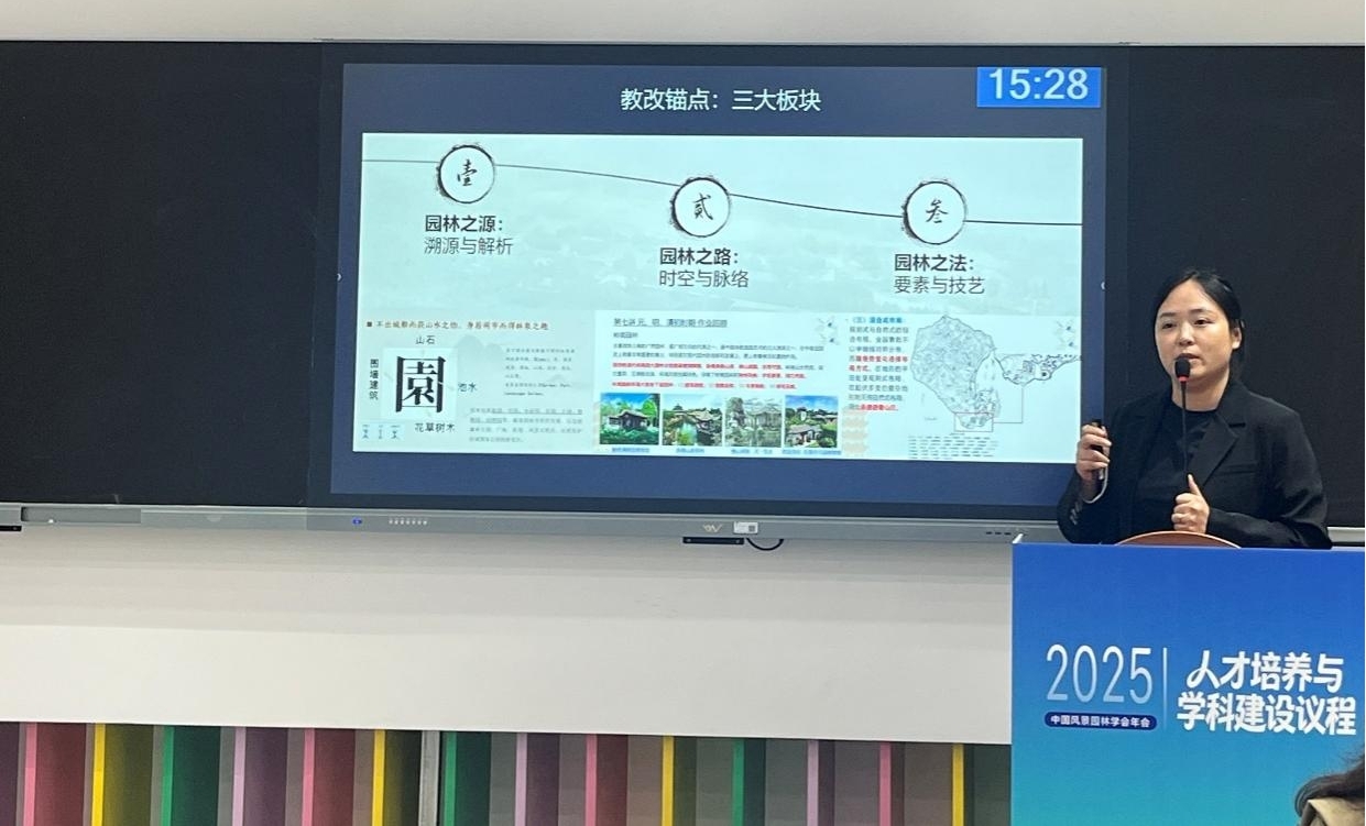 其中,人才培养与学科建设分会场成为本次年会的亮点之一。艺术与设计学院选派党委副书记岑铭君、环境设计专任教师苏小婷,与来自区内外高校及研究机构的专家学者共聚一堂,就风景园林教育领域的热点问题进行了深入交流与探讨。岑铭君副书记以“新时代美育浸润行动下应用型高校美育体系改革行动和实证探索研究”为题,分享了南宁学院艺术与设计学院在美育体系构建方面的创新实践与成效。她强调美育在培养具有社会责任感、创新精神和实践能力的高素质人才中的重要作用,并展示了学院通过课程优化、实践平台搭建、校园文化营造等措施,有效提升学生审美能力与人文素养的具体做法。她的发言引发了与会者的广泛共鸣,为风景园林教育中的美育改革提供了宝贵经验。