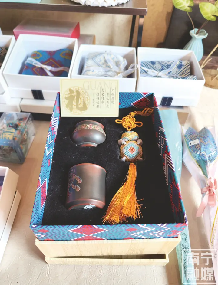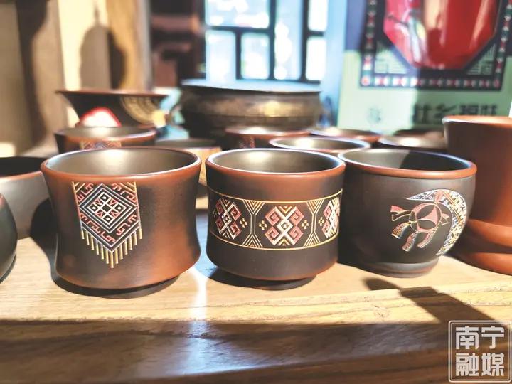 这种跨界打破了传统载体的局限——壮锦纹样从织物延伸至陶器,借由茶具、咖啡器具等生活用品走进现代场景,成为兼具实用价值与艺术魅力的文化载体。“以往外地游客选广西伴手礼,要分别买壮锦和坭兴陶,现在二者合一,文化传播效率更高了。”梁日照认为,创新不仅丰富了非遗的表现形式,更拓宽了市场空间,让壮锦之美以更立体的姿态触达大众。
