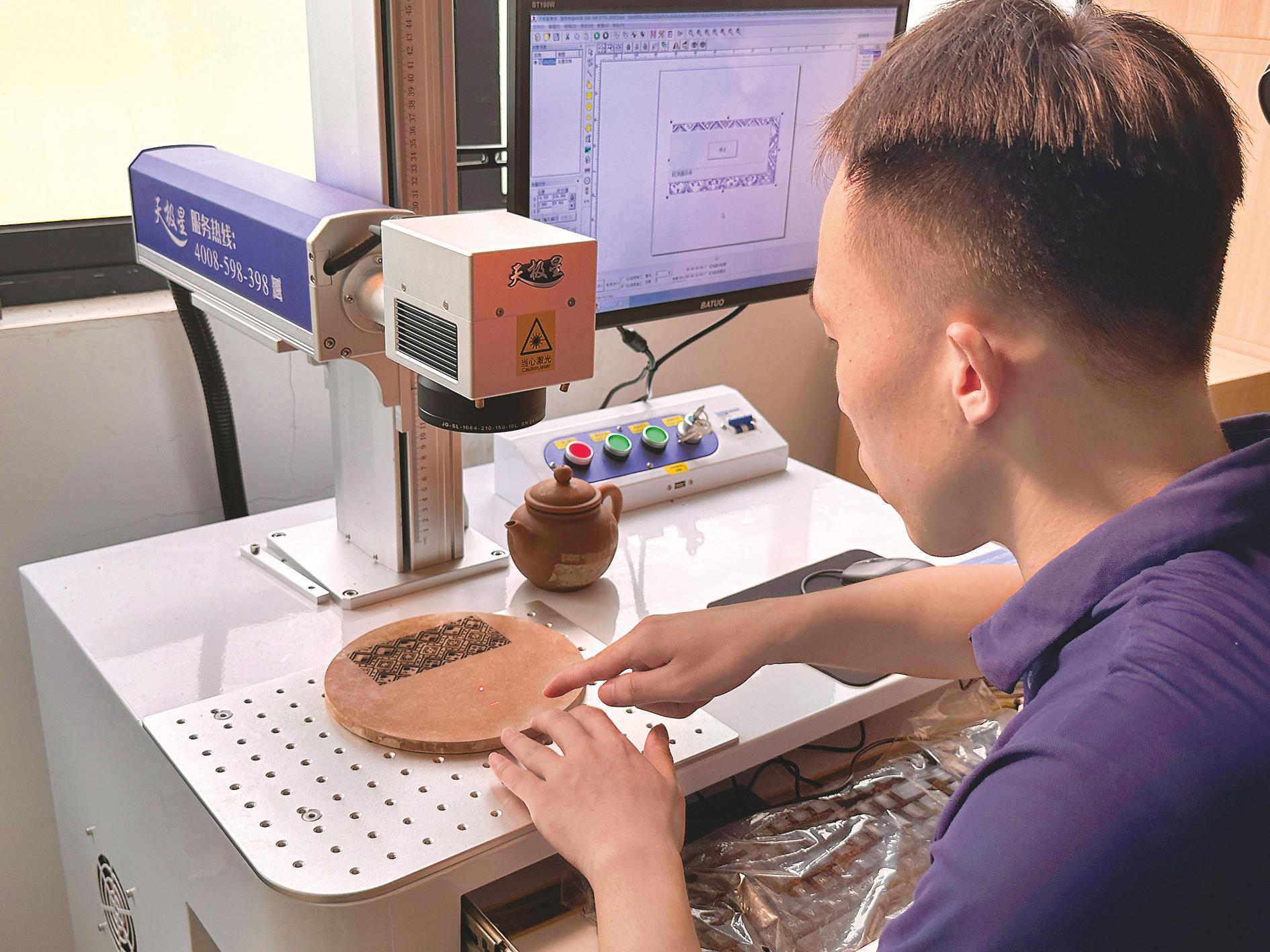 ▲梁日照展示如何使用激光雕刻机进行壮锦纹样雕刻。本报记者何璨汐 摄