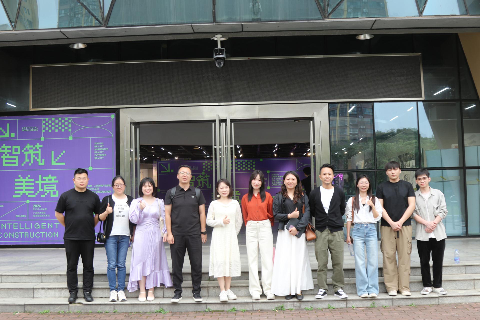 2026年4月2日,环境设计教研室组织师生赴广西艺术学院建筑艺术学院进行专业建设交流,观摩学习建筑艺术学院“智筑美境”本科毕业设计展,教研室课程组老师现场与广西艺术学院毕业设计指导老师、广西民族大学艺术学院环境设计系副主任覃宇老师共同参观毕业展览,现场围绕院校联合课程展览、虚拟教研室联合建立进行交流。