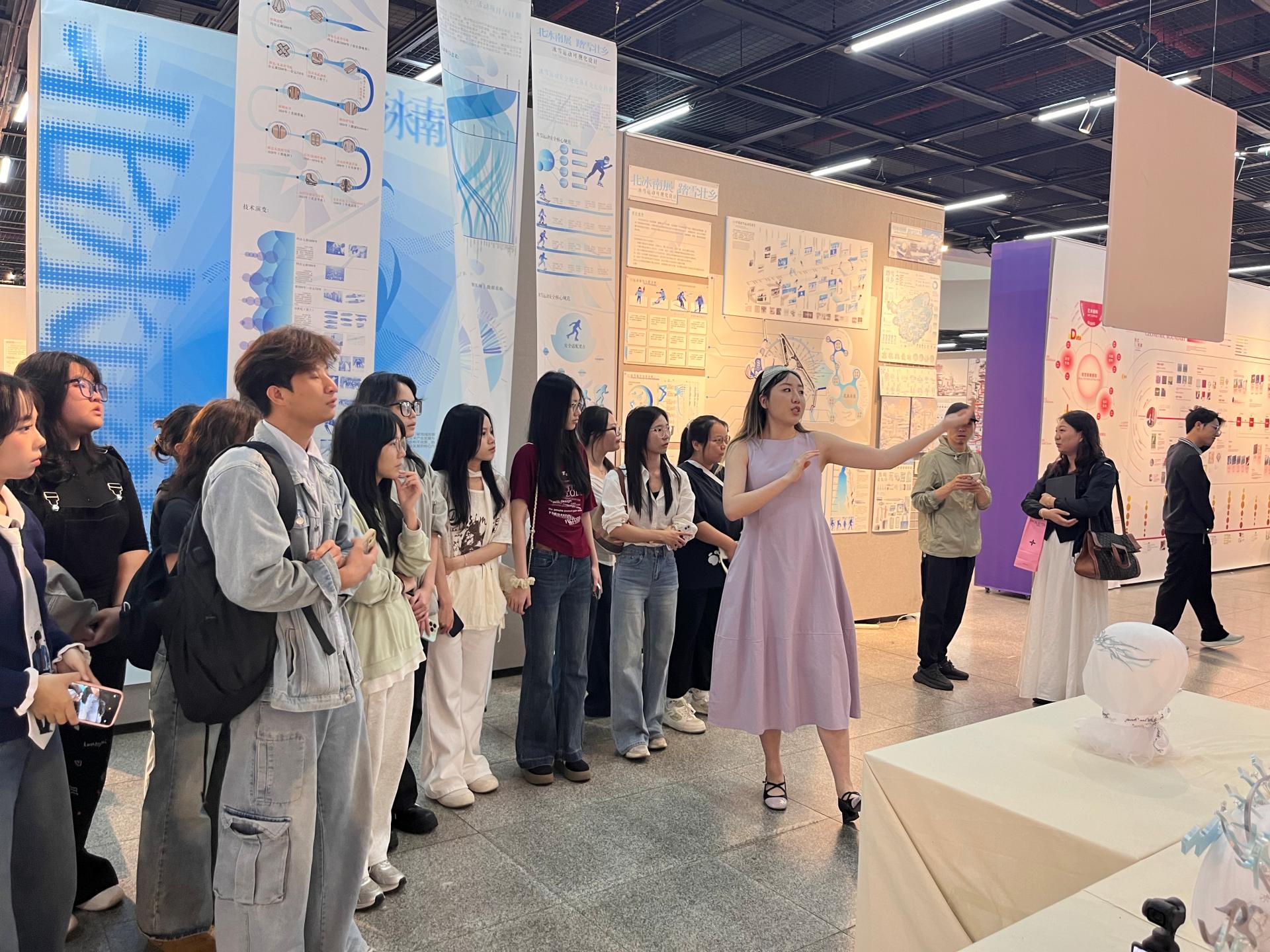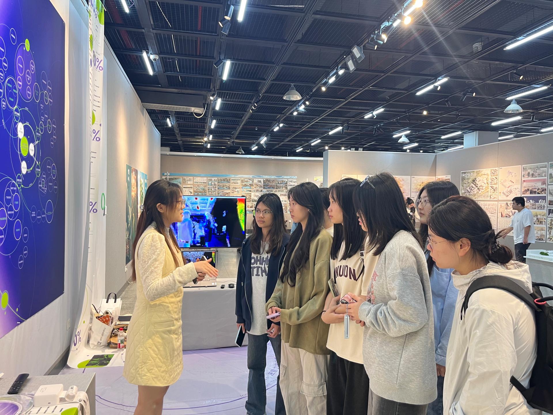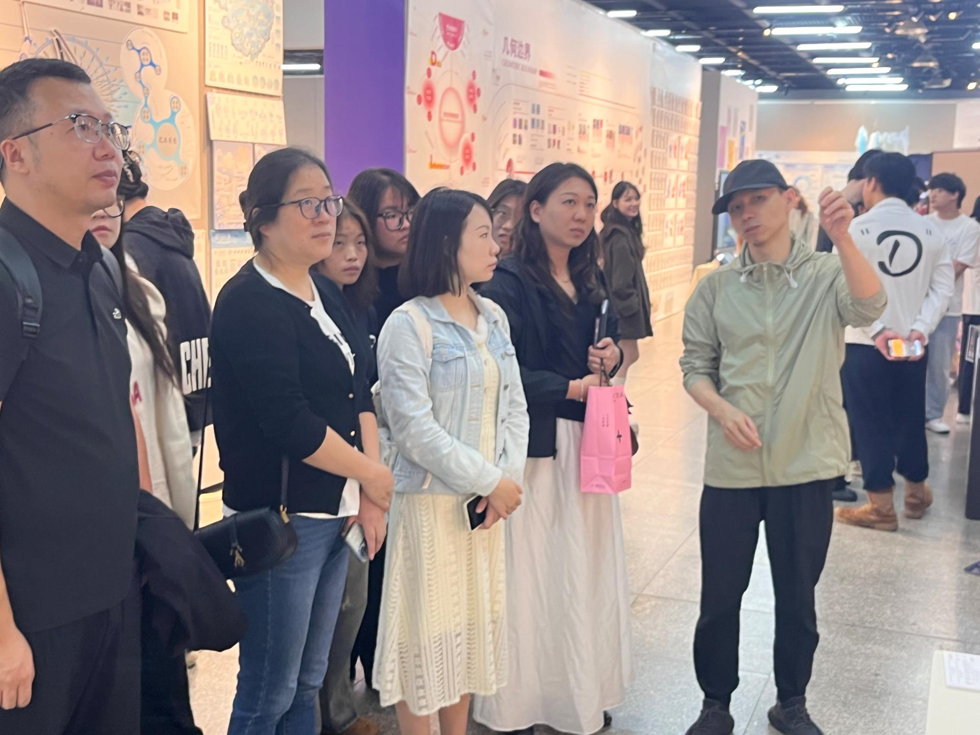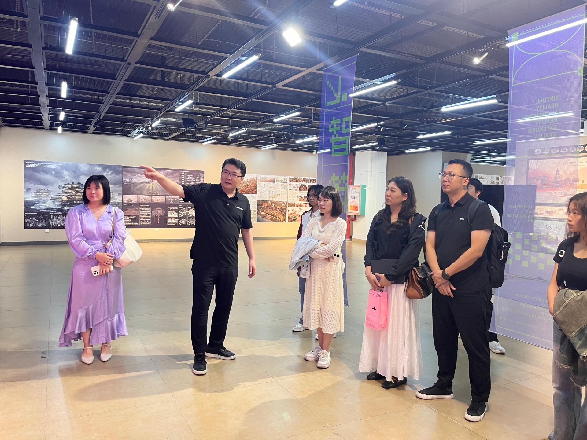 参观展览过程中,广西艺术学院建筑艺术学院环境设计系主任边继堔、艺术与科技系副主任涂照权老师对毕业展览进行总体讲解,本次展览集中展示了广西艺术学院建筑艺术学院2026届环境设计、风景园林、艺术与科技等专业的本科毕业设计成果,紧扣“智慧、人文、生态”三大维度,充分体现了专业教学与数字技术、地域文化和绿色发展理念的深度融合。展览中,生成式人工智能、参数化设计、虚拟现实等技术手段得到广泛应用,八桂地域文化元素在现代设计语境中实现创造性转化,同时积极回应“双碳”目标,展现了生态友好型设计的发展趋势。现场毕业团队学生对毕业设计作品进行现场分享创作理念、构思、调研地、交互应用、创新设计等,师生认真观展、积极互动,围绕设计理念、虚拟互动应用技术和专业发展方向、就业与考研进行了深入交流。