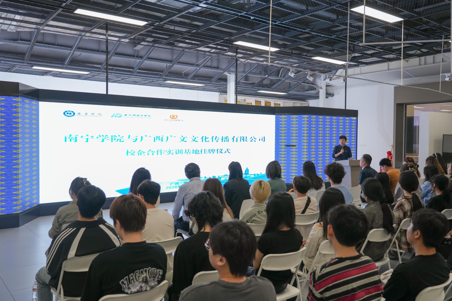 本次活动由南宁学院主办,南宁学院艺术与设计学院承办,广西广文文化传播有限公司协办。南宁学院艺术与设计学院副院长王春伟,新媒体教研室副主任臧琪,以及师生代表40余人共同参加活动。企业方代表还包括活动部项目经理王苗苗及综合办公室廖翔、覃楚亦等。( 文/图/叶晨涛 一审一校:任梦琪 二审二校:徐党卿 三审三校:黄宇)