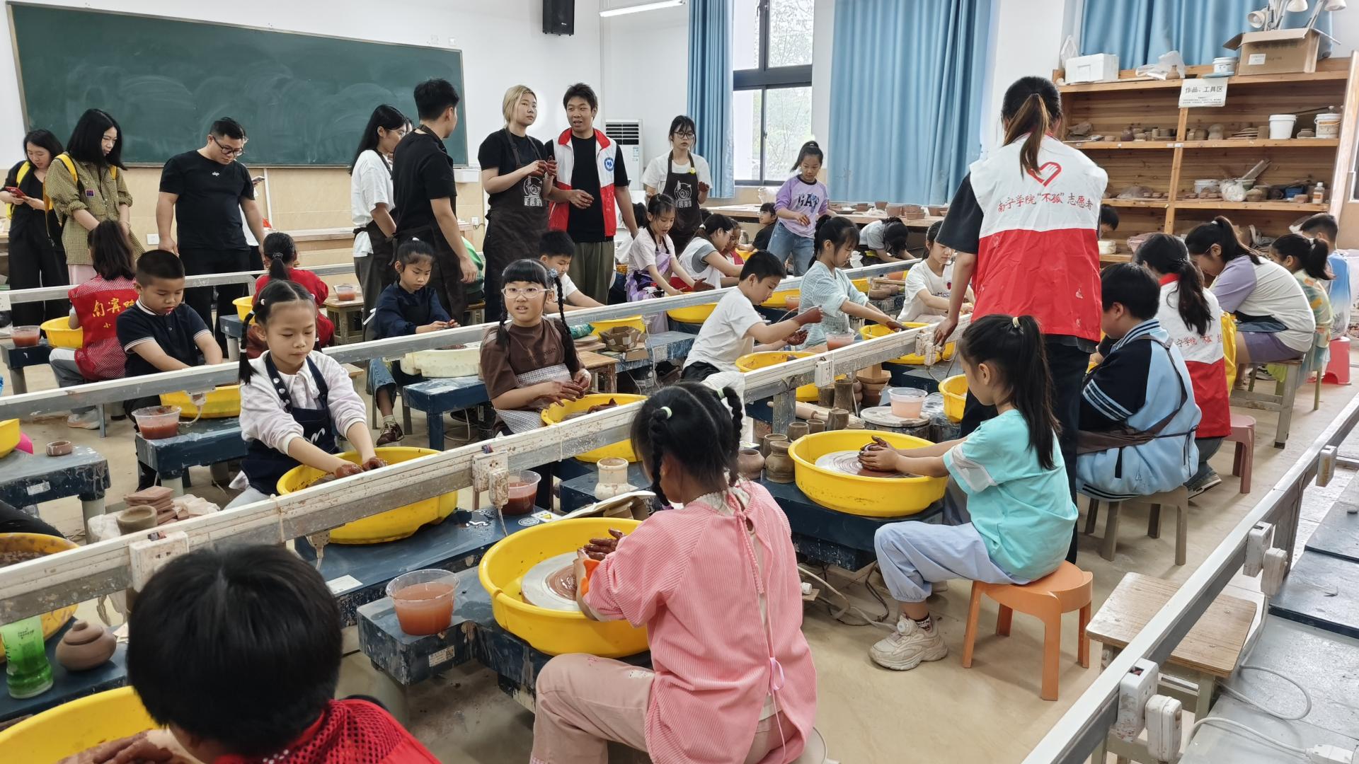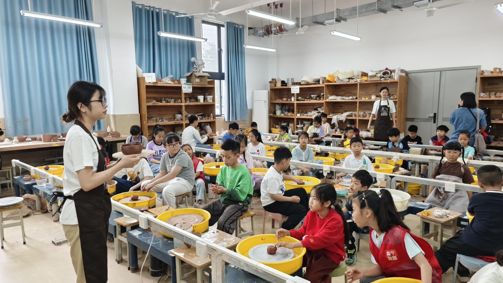 参观结束后,陶艺体验环节正式拉开帷幕。在师生志愿者的一对一指导下,小记者们亲手体验了揉泥、拉坯、塑形等陶艺制作的核心工序。从最初的一团陶泥,到逐渐成型的杯盏、摆件,每一位小记者都沉浸在创作的乐趣中,用双手赋予陶泥独特的生命。此次体验不仅让小记者们领略了传统陶艺的匠心之美,更让他们在大学校园的文化浸润中,悄悄萌发了对艺术专业、对大学生活的向往之情。