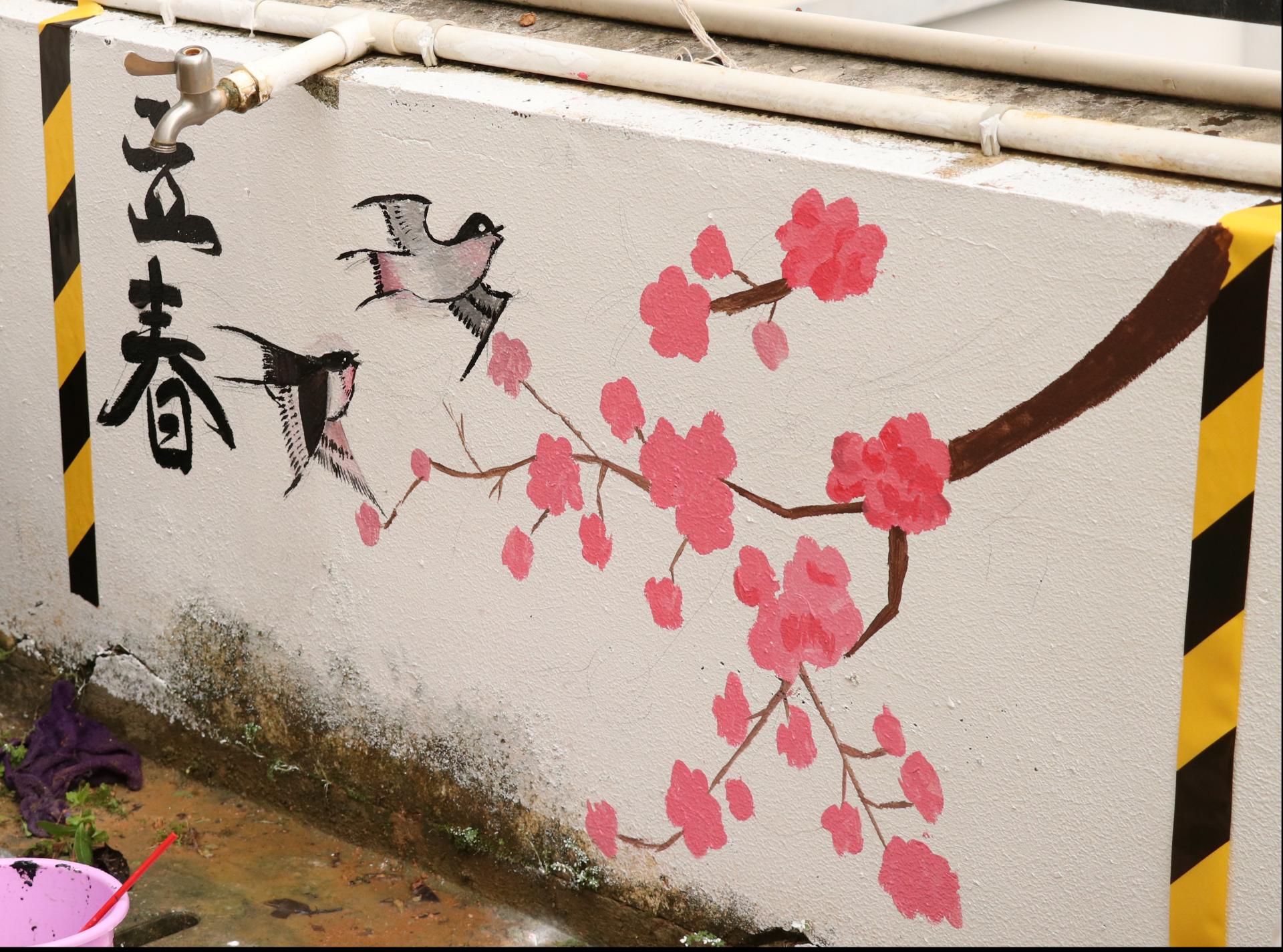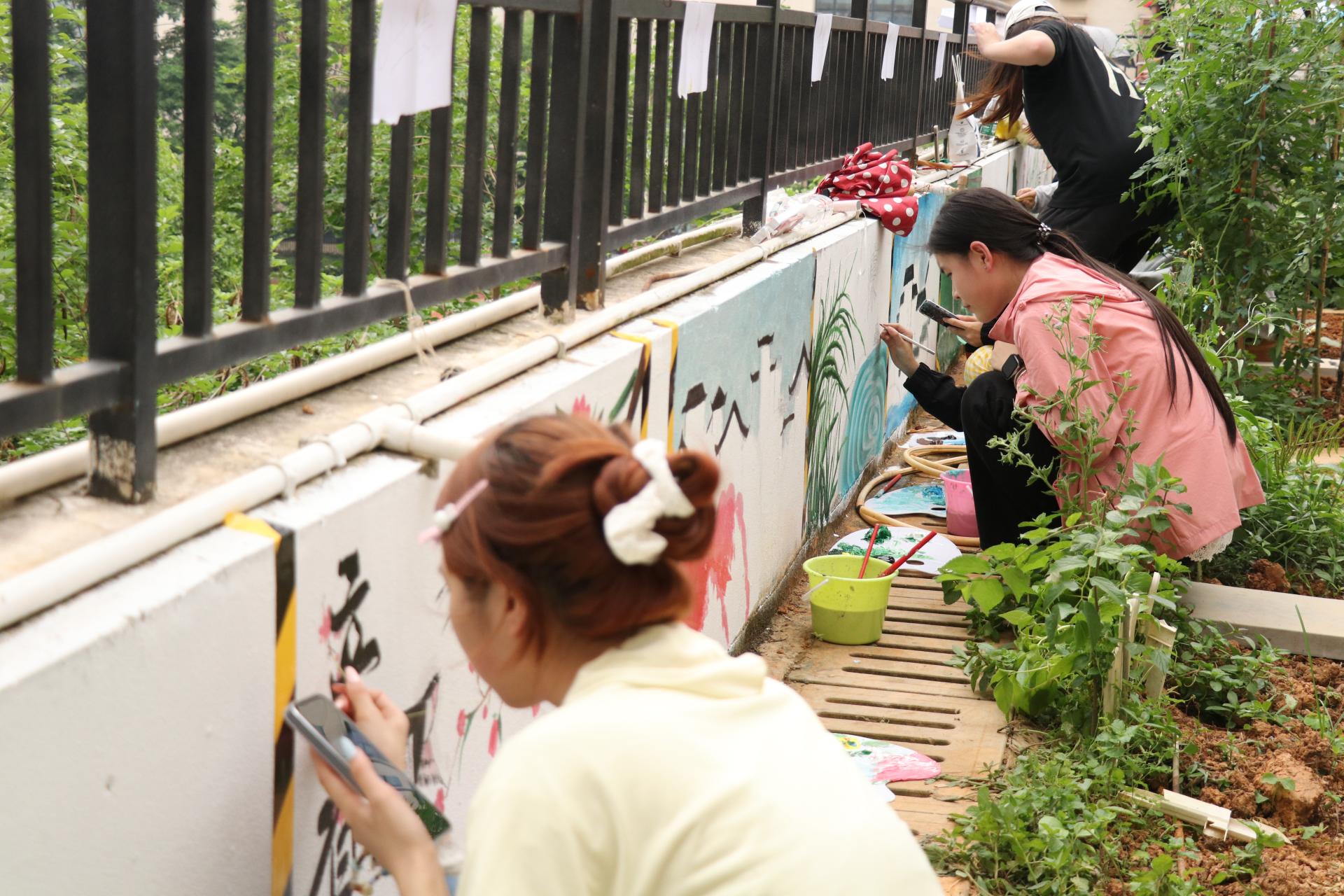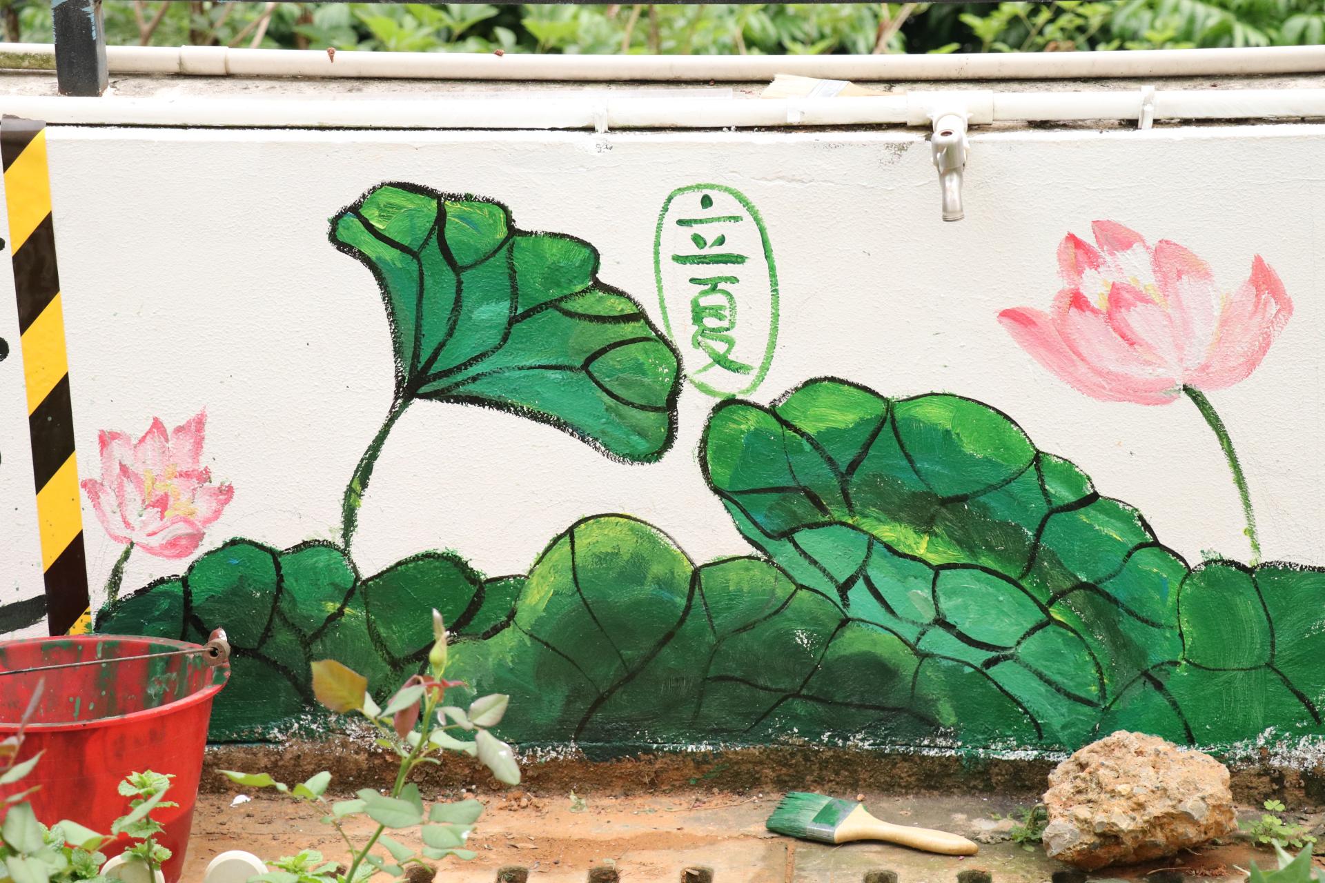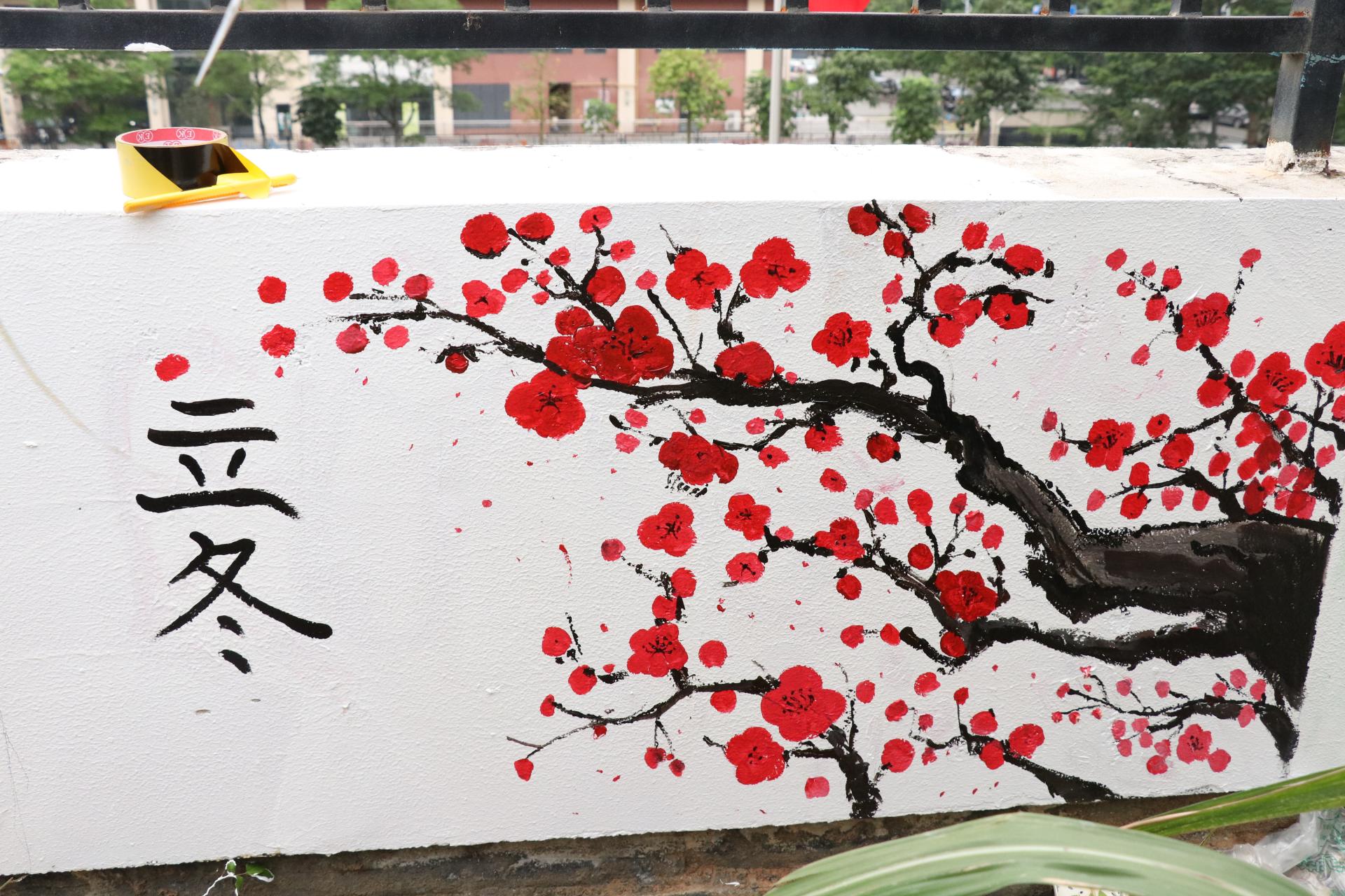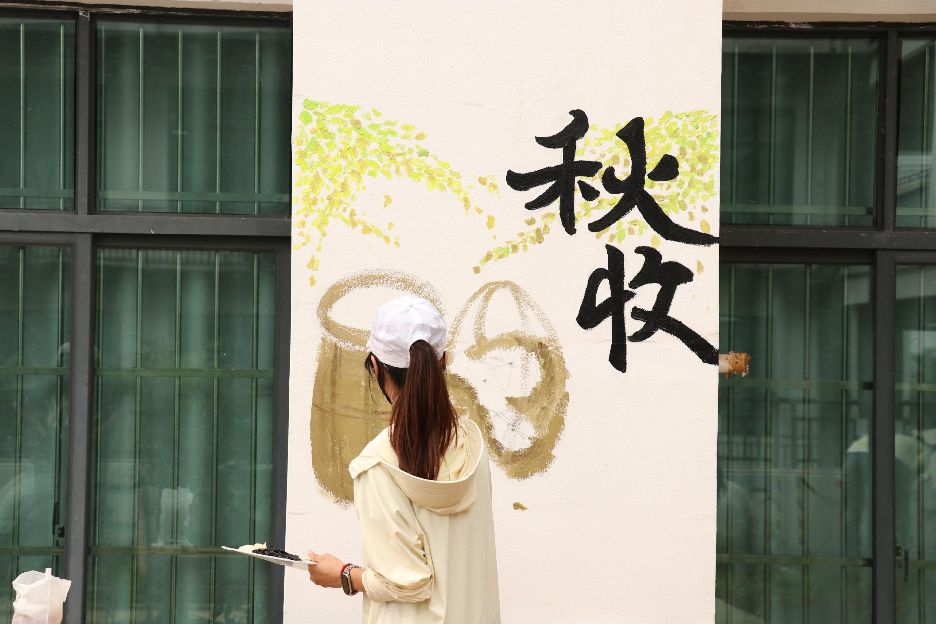 创作现场,志愿者们分工协作、默契配合:有的勾勒轮廓,有的调配色彩,有的细致填色,有的补全细节。从春日里衔泥的飞燕、盛放的花枝,到夏日亭亭玉立的荷花、“夏耘” 的笔墨意趣;从秋日金黄的稻穗、丰收的竹筐,到冬日静谧的雪景、温暖的意象,一笔一画都凝聚着志愿者们的巧思与用心。原本单调的墙面,在色彩的晕染下逐渐鲜活,成为校园里一道治愈又亮眼的风景线。