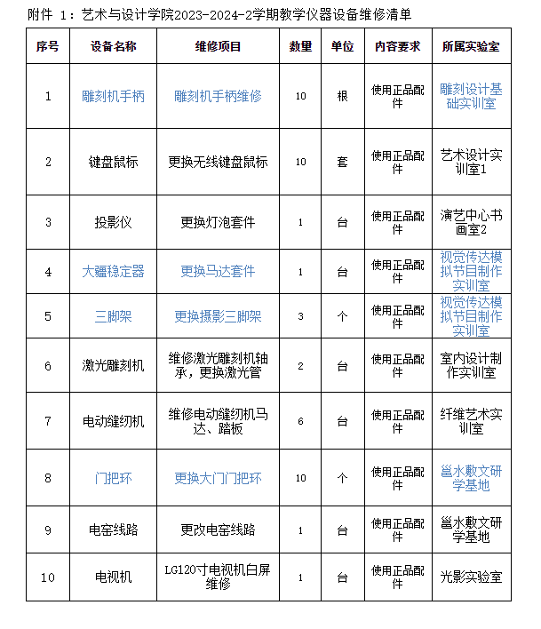 一、项目名称: 2023-2024-2学期教学仪器设备维修项目。