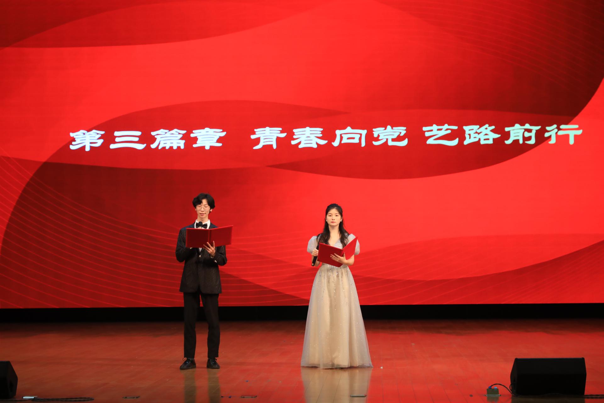 “青春向党 艺路前行”篇章中,由青年学子李亚轩、翟梦昕进行领学讲述。他们倡议青年学生要用中国红书写信仰和理想,书写希望和梦想。院主持人队的朗诵《以青春的名义向祖国报告》和工艺美术教研室教师的歌曲《南院的朋友来相会》等节目,表达了青年学子对党的忠诚和对未来的憧憬。学院行政教辅教师的歌舞《爱你》则将现场氛围推向高潮全体师生共同参与的《我们都是追梦人》更是展现了青年一代的壮志与豪情。