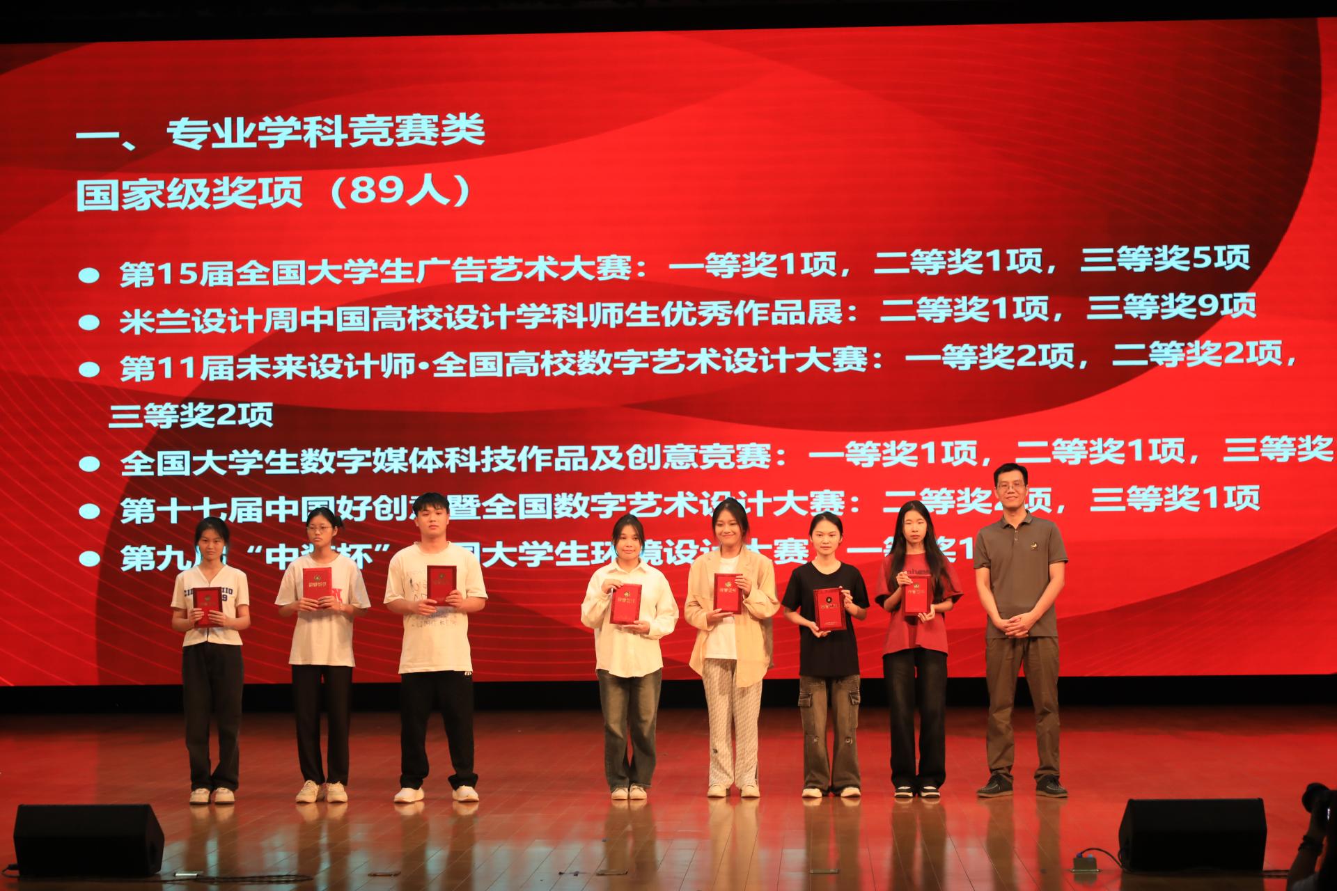 表彰先进树立典型,榜样示范引领前行。大课堂活动在呈现精彩纷呈的节目之余,还对过去一年优秀师生进行表彰。艺院学子一直秉持“沟通、创意、设计、制作”理念,不断争优创先,在学习生活的各方面取得了骄人的成绩。学生组表彰分为专业学科竞赛类奖项、互联网+大学生创新创业大赛奖项、全国大学生职业规划大赛奖项、国家级奖学金奖项、校级各类奖项。“教人千秋伟业,育人万世丰功。”在2023年,艺术与设计学院老师们秉持着“三全育人”的理念,聚焦十大育人体系构建,用专业铸就价值,用汗水谱写成就。教师组表彰分为“不孤”荣誉系列奖项,包括教学先锋、教学标兵、科研标兵、学工标兵等奖项,2023年度优秀共产党员、优秀党务工作者等奖项。