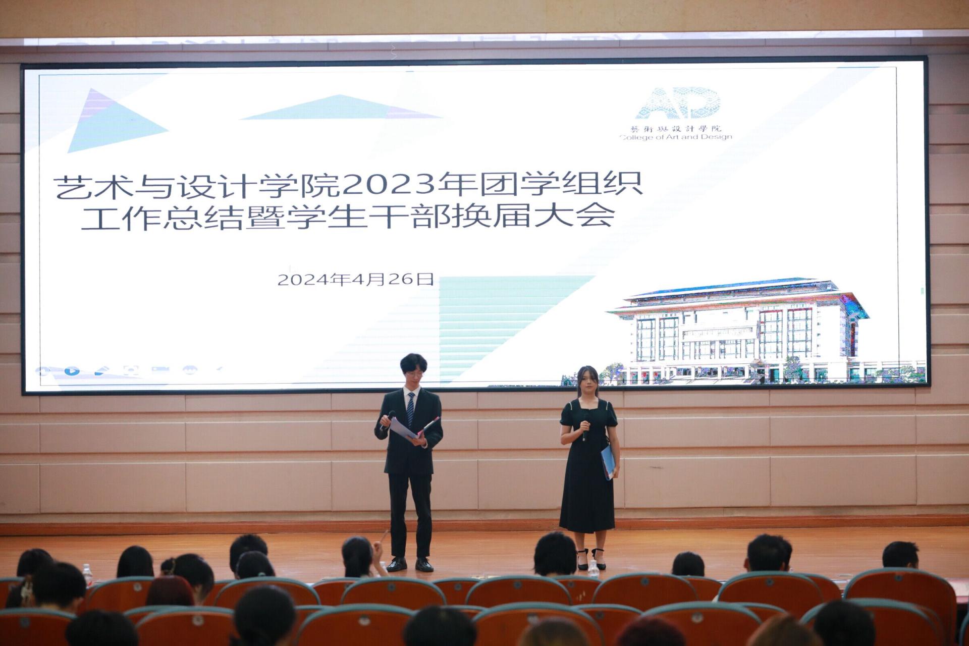 大会在校歌《锦绣前程 充满阳光》中拉开序幕。会上,首先由学院团委、学生会、自管会、新闻传媒中心主要负责人作2023年学生工作总结和个人述职报告。随后,与会人员观看了2023年团学干部活动剪影,剪影记录了团学干部们在校内外开展各项活动的精彩瞬间,肯定了团学干部一年以来辛勤付出。看完活动剪影后,在场领导老师为上一届团学干部和新一届团学干部分别颁发了荣誉证书和聘书。新聘任的团学干部代表黎倪君同学发表就职演讲,对未来工作进行展望。她表示新一届的学生干部将秉承上一届学长、学姐的优秀品质和优良的工作作风,继续努力,为学院学生工作发展贡献更多的力量,全心全意为同学服务,为老师分忧。