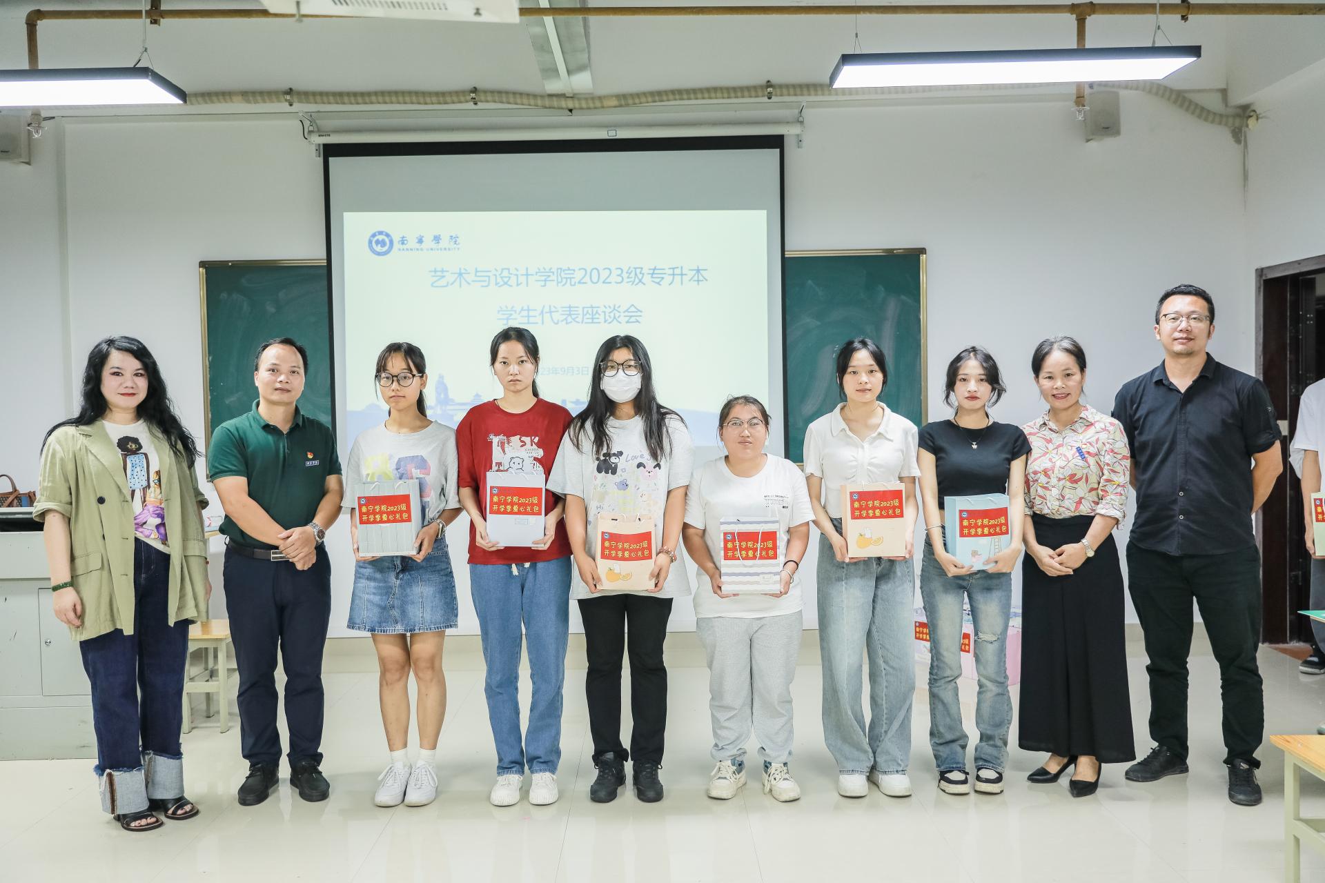 3日下午,学院在敷文综合楼406教室召开艺术与设计学院2023级专升本学生代表座谈会,学院院长杨小凤,副院长蓝志军出席会议,环境设计教研室主任袁国凯、新媒体艺术专业负责人农琳琳、郭莉等4位2023级专升本班级辅导员,以及56位2023级专升本新生代表参加了本次座谈会。座谈会由学生科科长覃兆刚主持。会上,学生就专业学习、新校园生活环境、个人未来发展等方面存在的疑问进行提问,领导老师们逐一回答,努力为新生排忧解难,关心关怀新生。随后,杨小凤院长对与会学生代表提出三点希望:一是希望全体与会学生能早日熟悉和适应新环境的学习与生活,积极转变角色,全身心投入新阶段的学习;二是希望全体与会学生认真思考,做好大学两年中的短期、长期学习规划及未来的职业生涯规划;三是希望全体与会学生注重个人综合能力的培养和提升,除了完成个人学业外,还要积极参加社会实践活动、文体活动及专业比赛等。会后,学院领导老师为与会学生发放爱心礼包,鼓励学生们不畏困难,砥砺前行。
