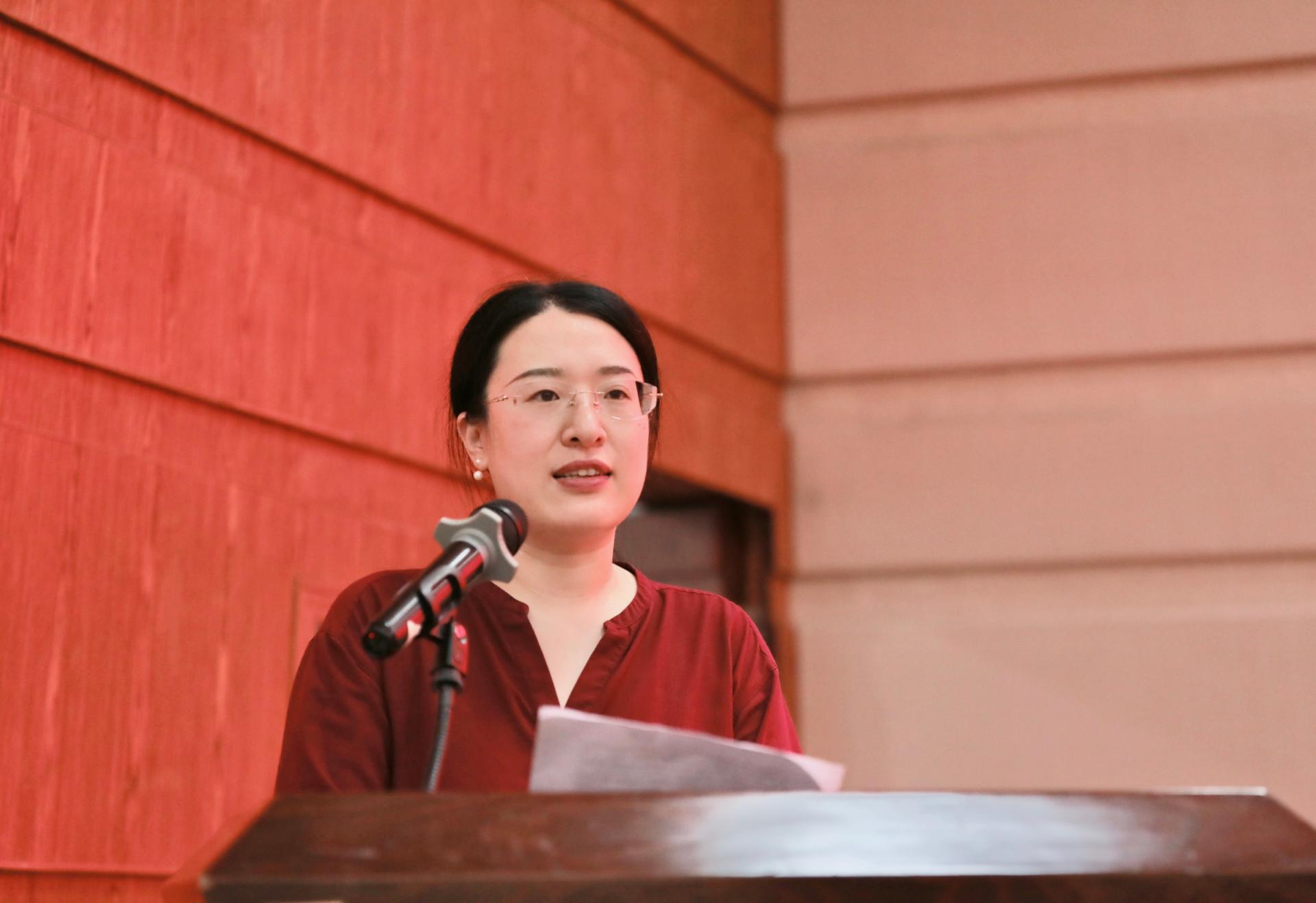视觉传达设计教研室陈少华老师作为教师代表上台发言,她代表全院教师向毕业生们送上诚挚祝福,并提出三点希望:一是希望全体毕业生不忘初心,在艺术设计的道路上永不停步;二是希望全体毕业生能继续追求匠心,再往后的工作中发扬工匠精神;三是希望全体毕业生心中有国,肩上有责,脚下有力,努力为社会做出贡献。