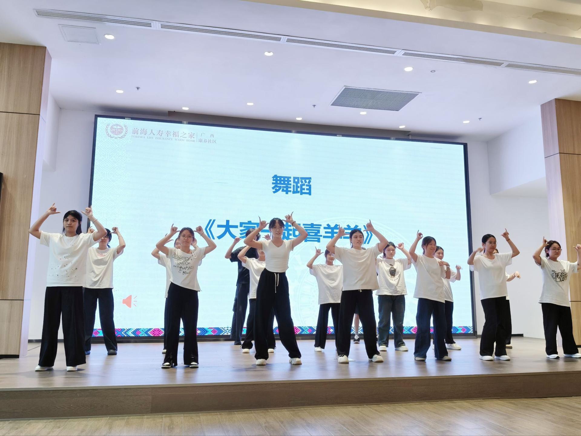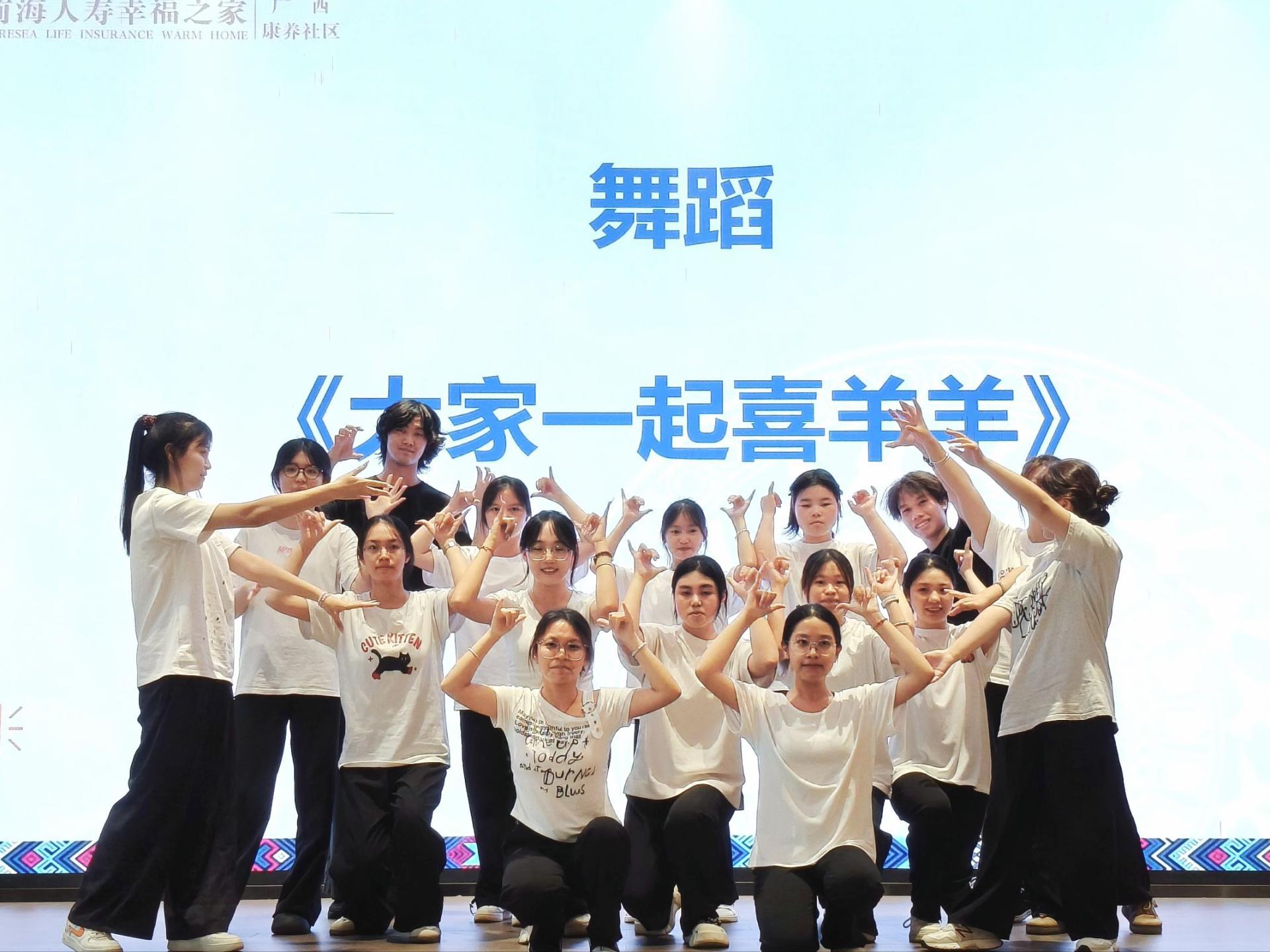 活动当天,志愿者们分为场务服务组和节目表演组,各司其职,紧密配合。 场务服务组的同学们提前抵达活动现场,精心布置场地,悬挂节日装饰,营造出浓厚温馨的节日氛围。活动中,他们积极引导老人有序入场、就座,耐心协助行动不便的长者,并细致周到地做好活动过程中的各项后勤保障工作,确保了庆典活动的顺畅进行。 节目表演组的同学们则充分发挥艺术与设计学院的专业特长,为幸福之家的长者们带来了一场精彩纷呈舞蹈表演节目 《大家一起喜羊羊》。精彩的表演不仅传递了节日的喜悦,更表达了同学们对长者们最真挚的祝福。